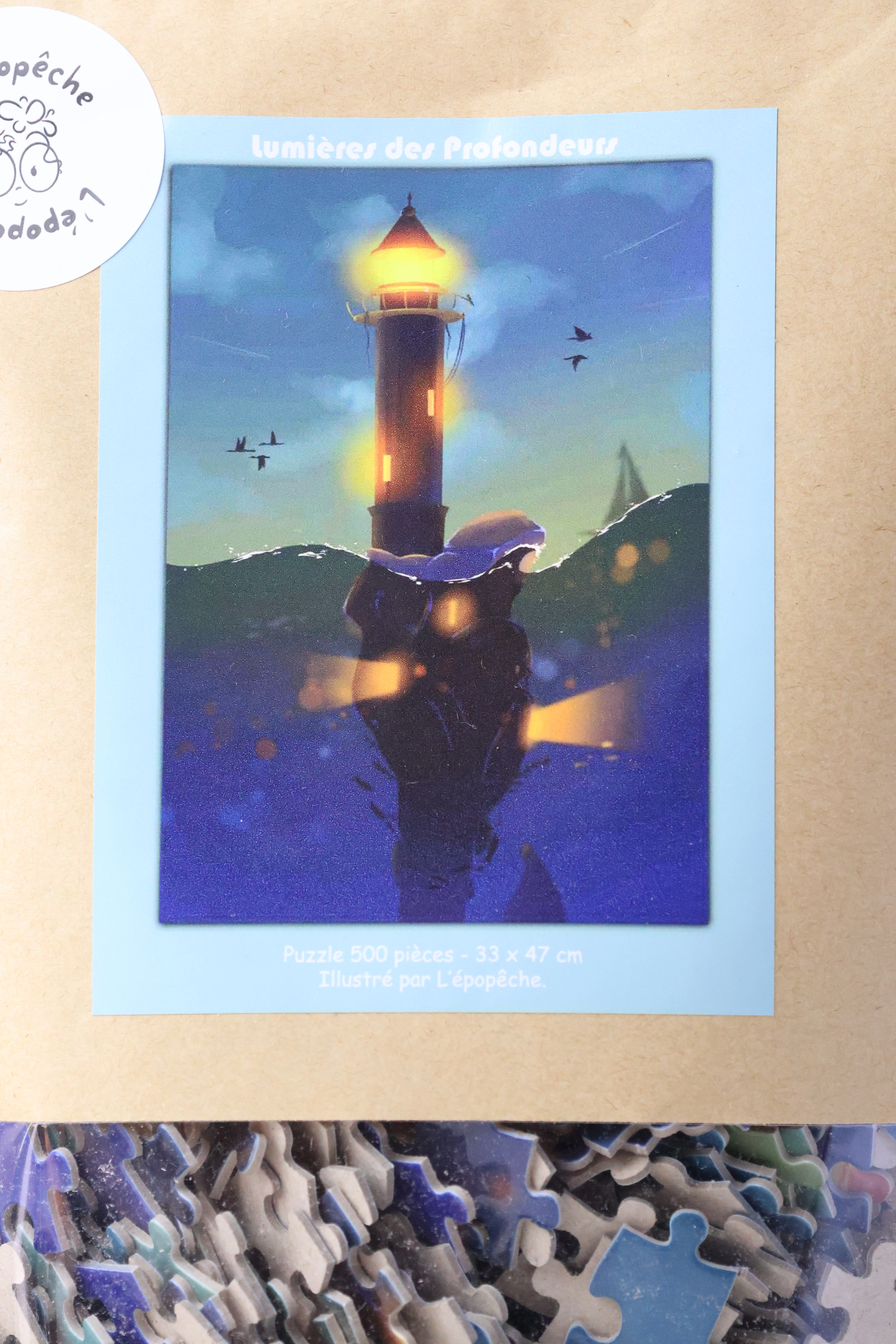 Description : Puzzle 500 pièces Lumières des Profondeurs. Détails du Produit : Dimensions du puzzle terminé : 33 x 47cm Fabriqué en France Illustré par L'épopêche Emballage kraft Difficulté =...