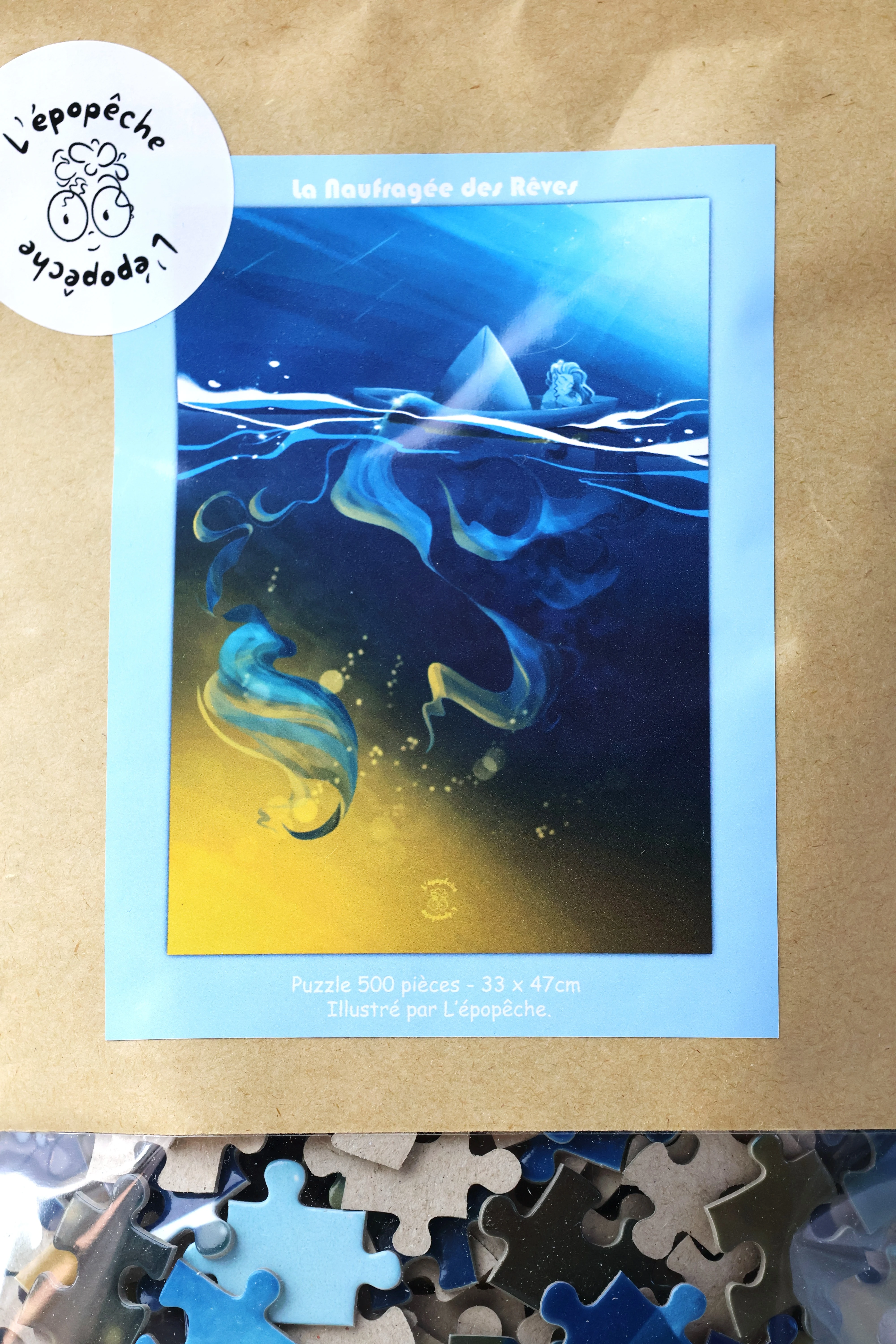 Description : Puzzle 500 pièces La Naufragée des Rêves, représentant une sirène dans un bateau en papier dérivant sur une mer paisible. Détails du Produit : Dimensions du puzzle terminé : 33 x...